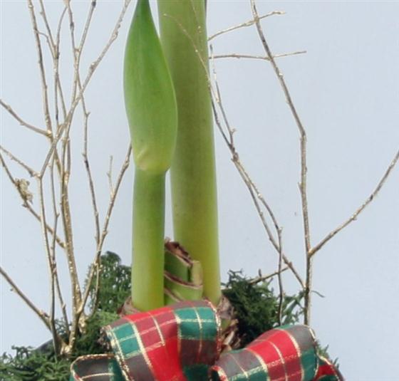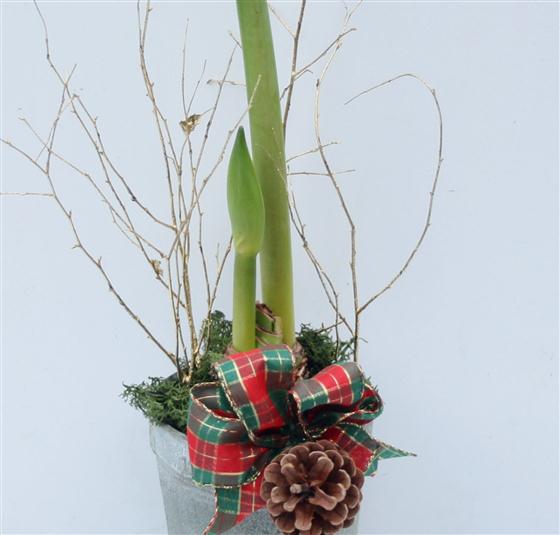 Amaryllis plant in a ceramic container and finished with a tartan/xmas ribbon and gold twigs.