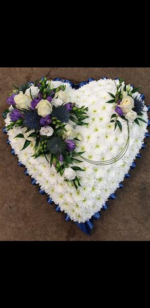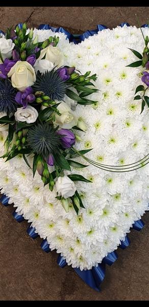 13" or 17" frame with a ribbon edge, based in white chrysanth and a pretty spray