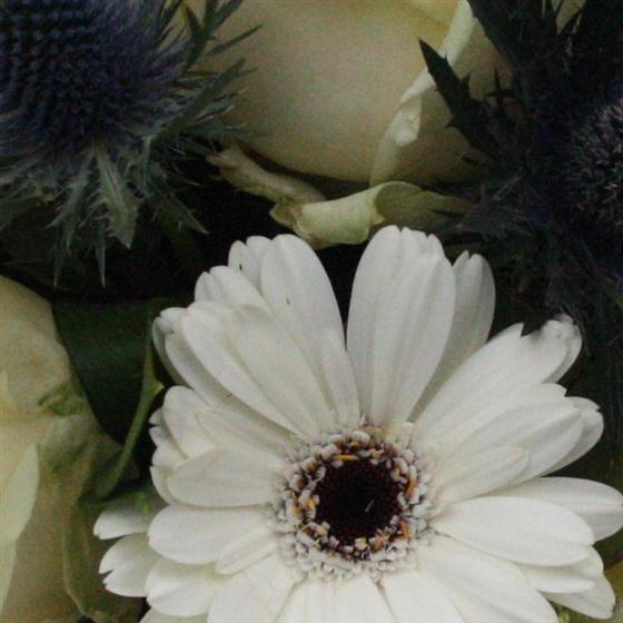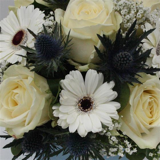 A blue and white cube arrangement of roses and gerberas with eryngium and gypsophila. Colour of cube may vary