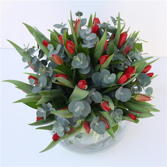 A beautiful bouquet full of red tulips finished with eucalyptus.