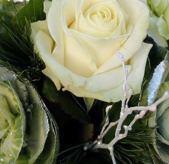 An exotic white, green and silver festive bouquet including white roses, gerberas and other seasonal white blooms