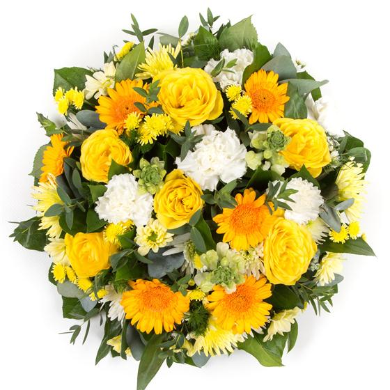 This colourful posy arrangement mixes seasonal flowers in golds,