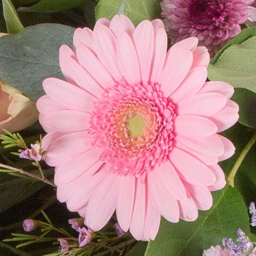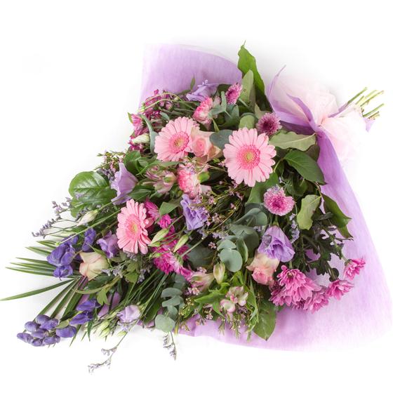 A pretty selection of seasonal flowers in lilacs and pinks with complementing foliage.
