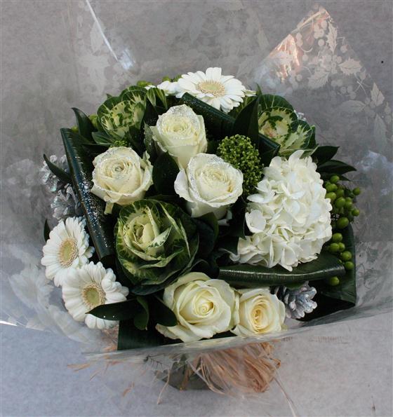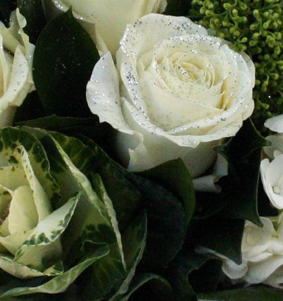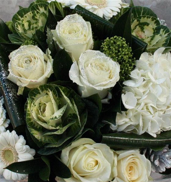 This is a beauty. Features grouped flowers to include white roses, white germini, white cabbage, green hypericum and white glitter cones.