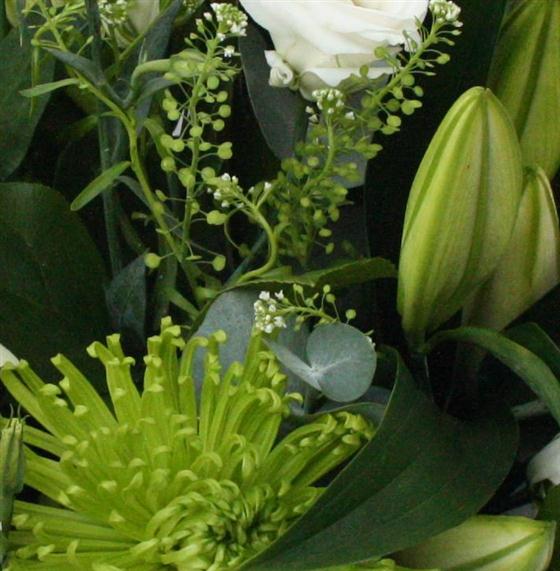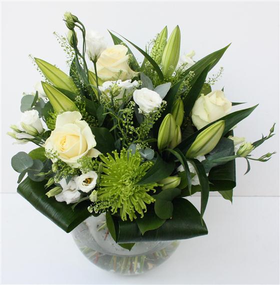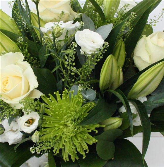 A stunning bouquet filled with white lilies, white naomi roses, white lisianthus and shamrock chrysanths.