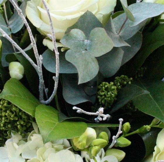 A wintery hand tied bouquet that really features the frosty winter days with the delight of white stunning flowers. Includes white scented freesia's, white naomi roses, blues thistle, pussy willow, white birch twigs and green foliages to finish.